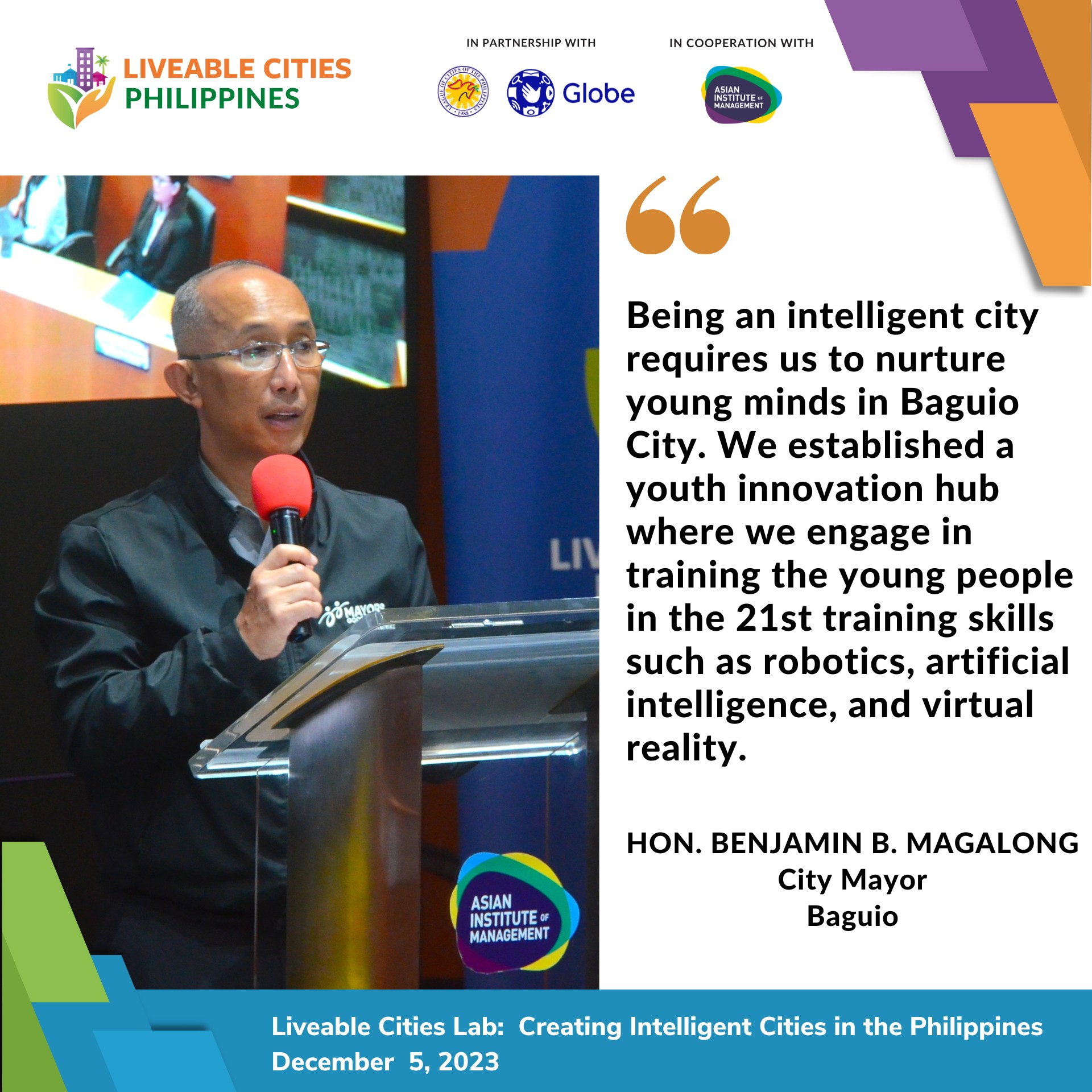 The digital era has highlighted an important need for urban centers to adjust and progress in a thoughtful manner. In the Philippines, the idea of intelligent cities has emerged as a potential resolution for constructing enduring, competitive, and liveable places to live. The Liveable Cities Lab: Creating Intelligent Cities in the Philippines brought together experts from national government, local government, academe, and visionary leaders to explore the latest helpful innovations and answers and discuss how these can be utilized to build perceptive, sustainable, and resilient cities. The Liveable Cities Lab encouraged insightful dialogues, shared ideas, and advanced innovative strategies that can help guide other cities to the future advancement of the Philippines.